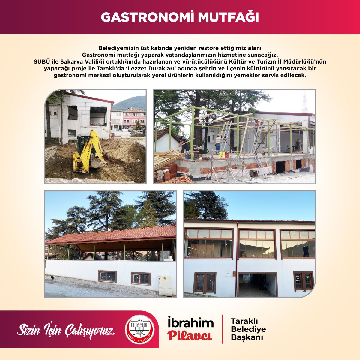 Belediyemizin üst katında yeniden restore ettiğimiz alanı Gastronomi mutfağı yaparak vatandaşlarımızın hizmetine sunacağız. SUBÜ ile Sakarya Valiliği ortaklığında hazırlanan ve yürütücülüğünü Kültür ve Turizm İl Müdürlüğü’nün yapacağı proje ile Taraklı’da ‘Lezzet Durakları’ adında şehrin ve ilçenin kültürünü yansıtacak bir gastronomi merkezi oluşturularak yerel ürünlerin kullanıldığını yemekler servis edilecek.