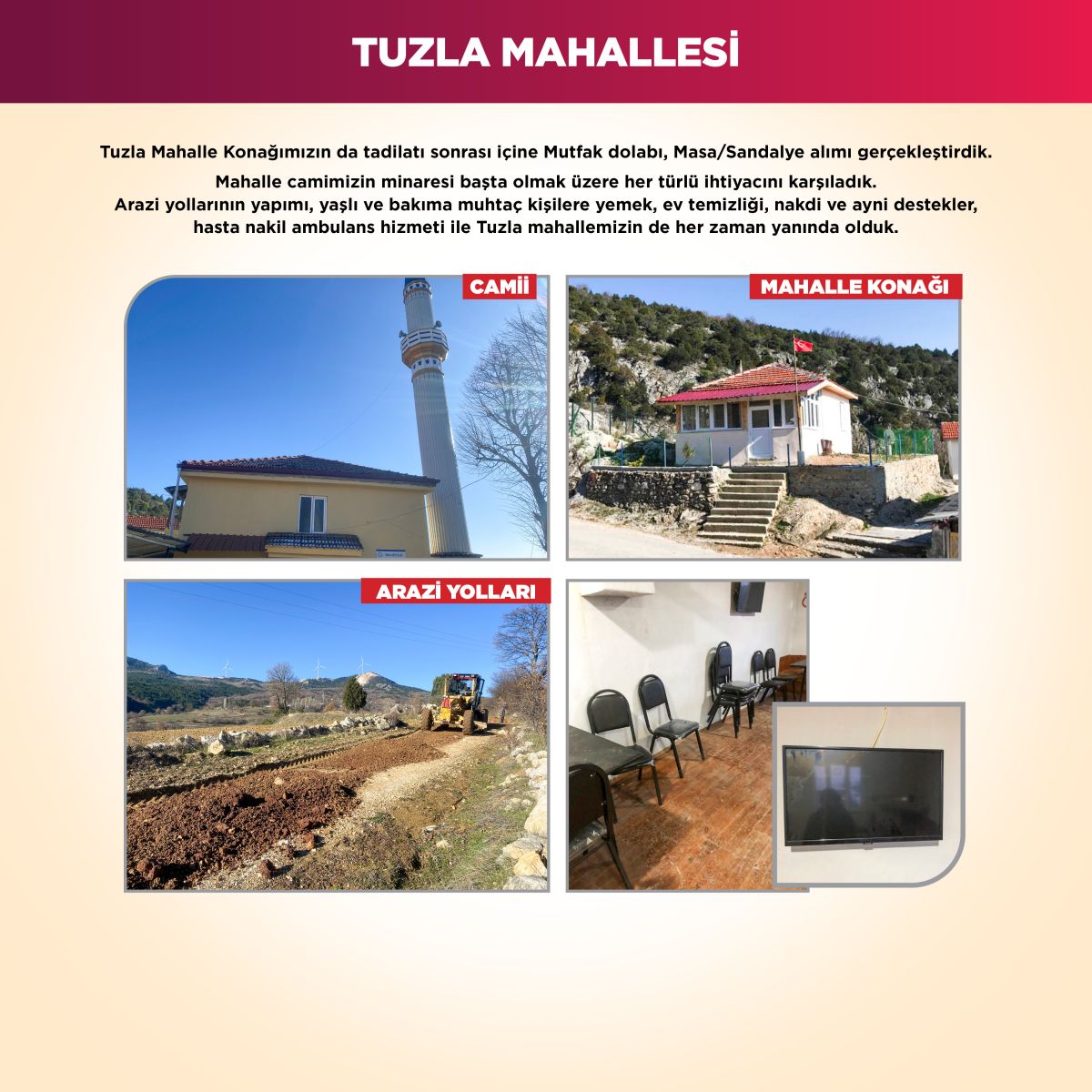 Mahalle camimizin minaresi başta olmak üzere her türlü ihtiyacını karşıladık. Arazi yollarının yapımı, yaşlı ve bakıma muhtaç kişilere yemek, ev temizliği, nakdi ve ayni destekler, hasta nakil ambulans hizmeti ile Tuzla mahallemizin de her zaman yanında olduk.